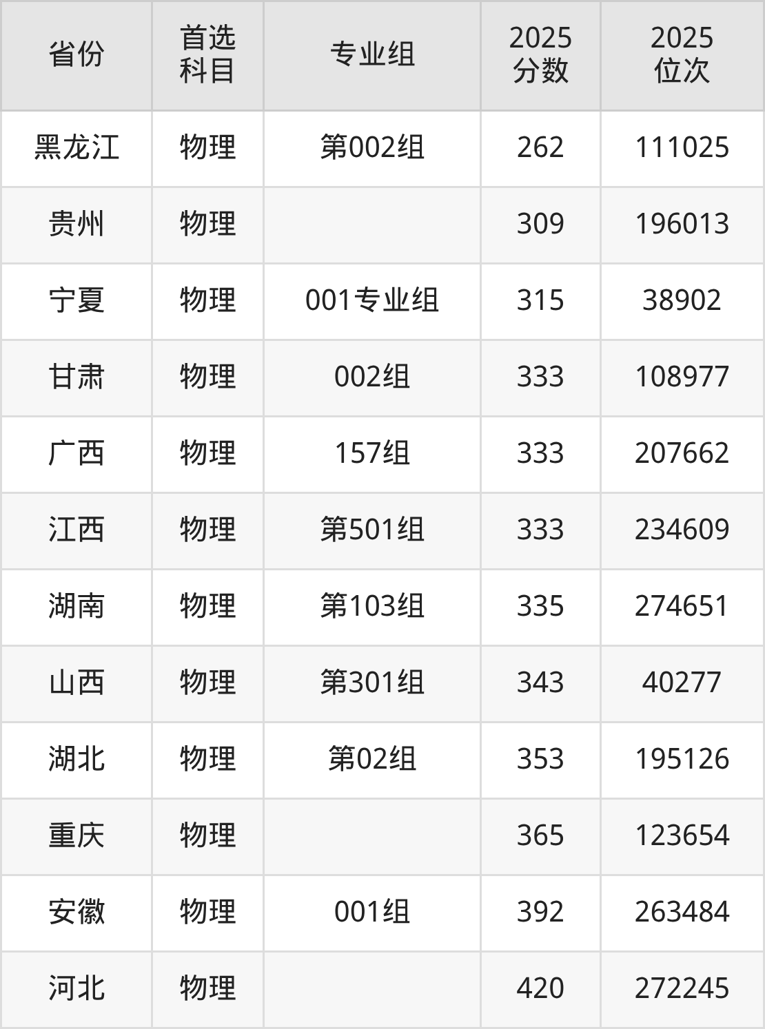 物理類最低分對應地區(qū)為江蘇(02組),錄取位次為66935;最高分對應地區(qū)為河北,錄取位次為272245。
