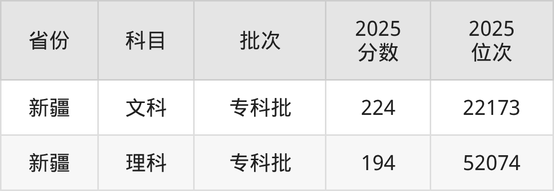 文科最低分對(duì)應(yīng)地區(qū)為新疆,錄取位次為22173,超專科線84分。