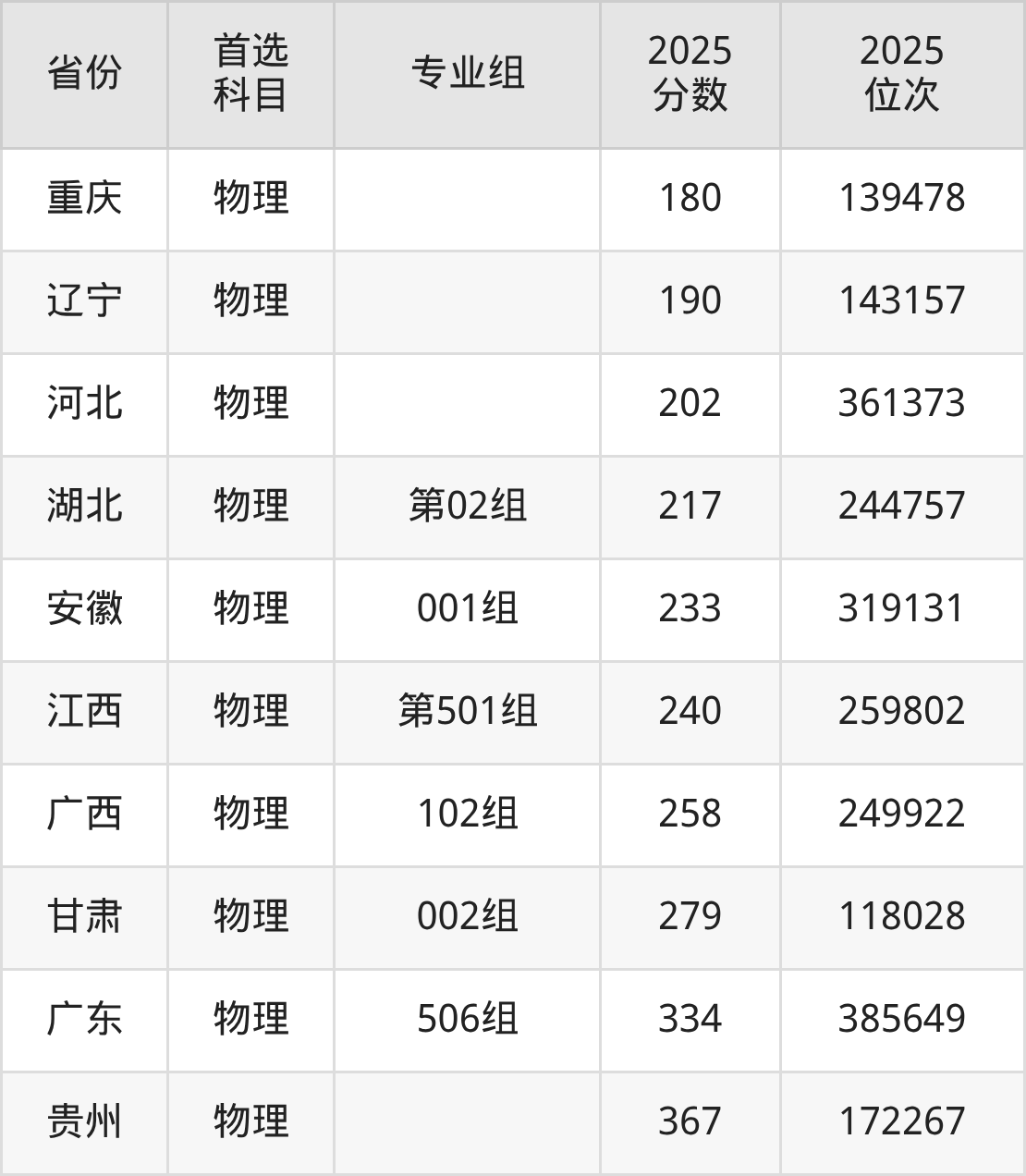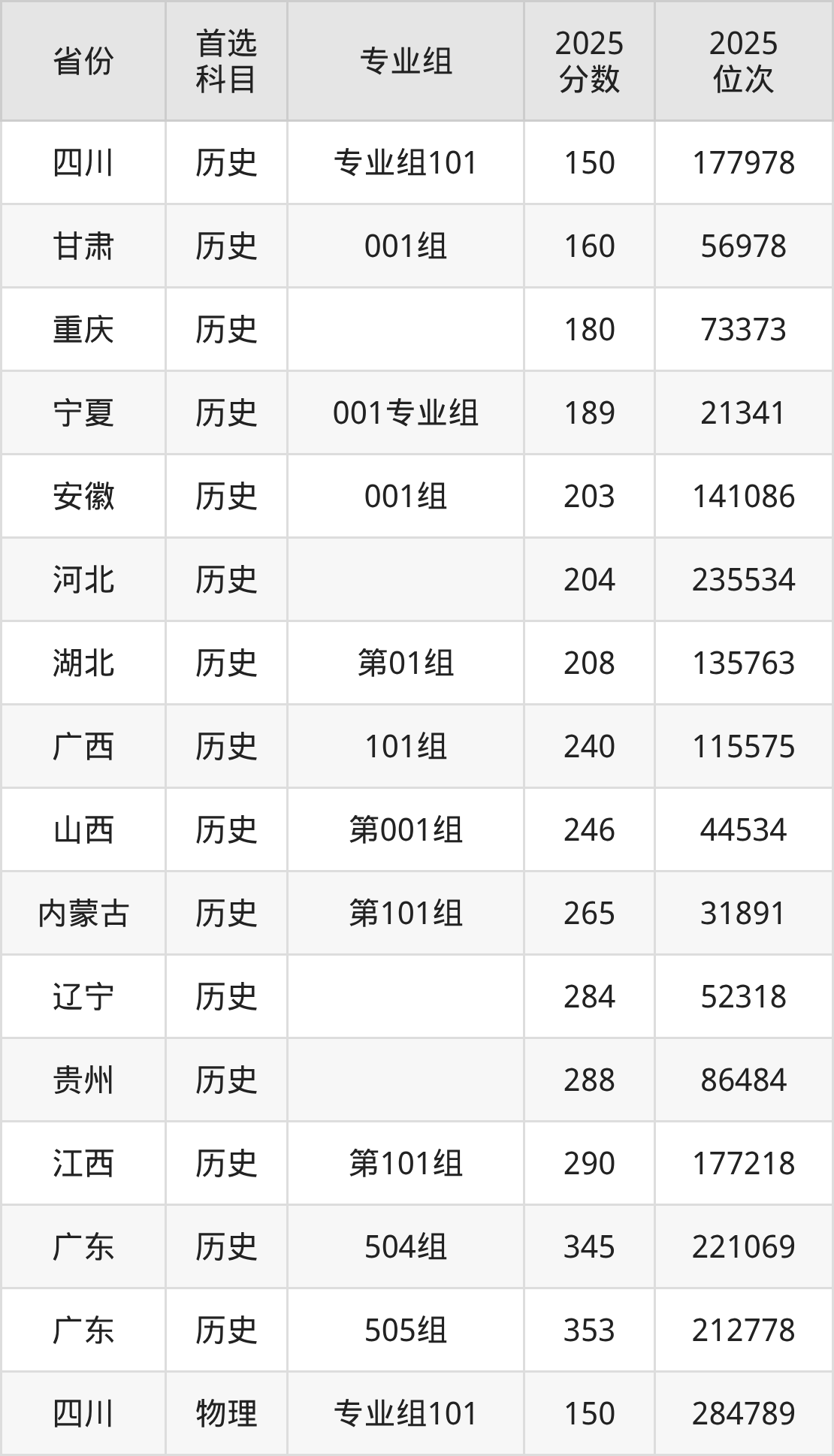 物理類最低分對(duì)應(yīng)地區(qū)為四川(專業(yè)組101),錄取位次為284789;最高分對(duì)應(yīng)地區(qū)為貴州,錄取位次為172267,超??凭€187分。
