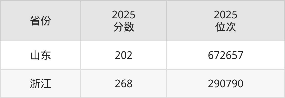 最低分對(duì)應(yīng)地區(qū)為山東,錄取位次為672657,超二段線52分;最高分對(duì)應(yīng)地區(qū)為浙江,錄取位次為290790。