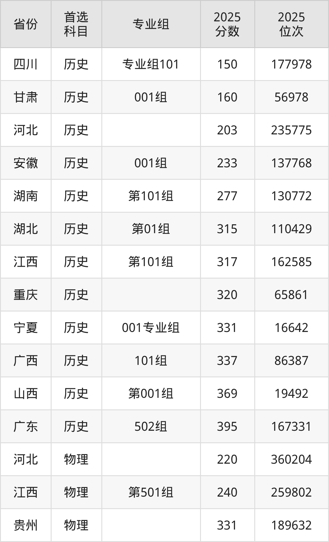 歷史類最低分對應(yīng)地區(qū)為四川(專業(yè)組101),錄取位次為177978;最高分對應(yīng)地區(qū)為廣東(502組),錄取位次為167331。