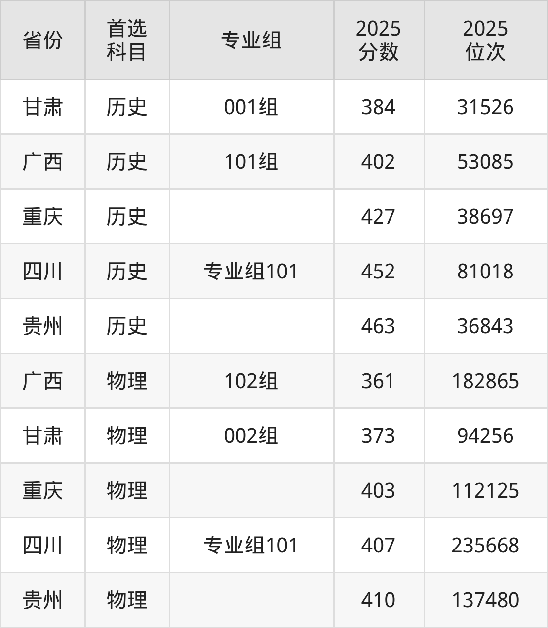 歷史類最低分對應(yīng)地區(qū)為甘肅(001組),錄取位次為31526,超??凭€224分;最高分對應(yīng)地區(qū)為貴州,錄取位次為36843,超??凭€283分。