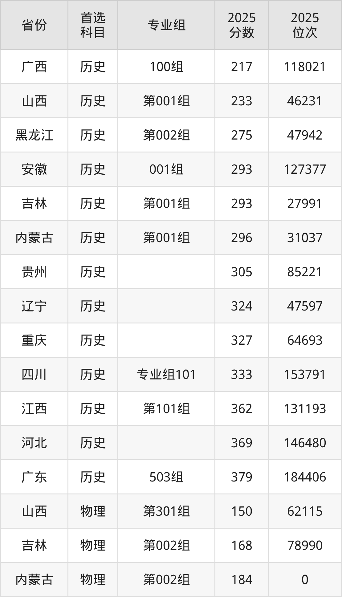 歷史類最低分對應(yīng)地區(qū)為廣西(100組),錄取位次為118021,超專科線17分;最高分對應(yīng)地區(qū)為廣東(503組),錄取位次為184406,超專科線164分。