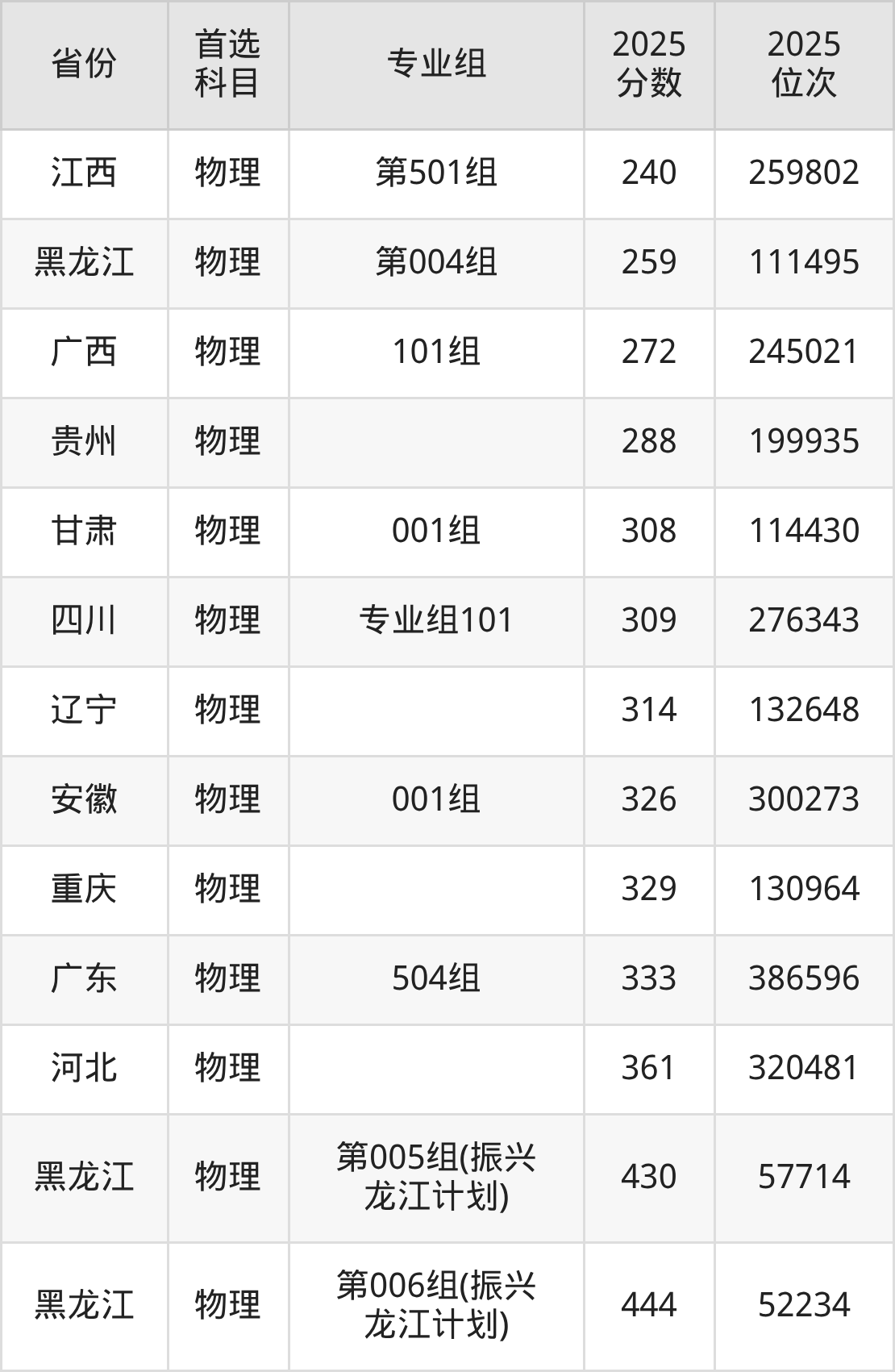 物理類最低分對應(yīng)地區(qū)為山西(第301組),錄取位次為62115;最高分對應(yīng)地區(qū)為黑龍江(第006組(振興龍江計劃)),錄取位次為52234,超??凭€284分。
