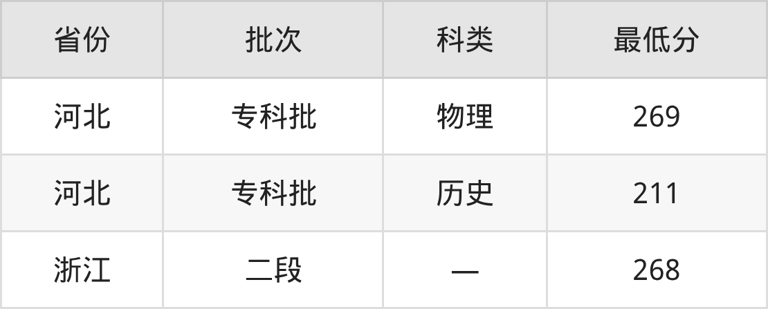 四川電子機(jī)械職業(yè)技術(shù)學(xué)院現(xiàn)代通信技術(shù)專業(yè)在全國各省最低錄取分?jǐn)?shù)線為211分(河北歷史類),除此之外,在其余地區(qū)的最低分為浙江268分,以上數(shù)據(jù)均為2025年數(shù)據(jù),供2026年高考生參考。