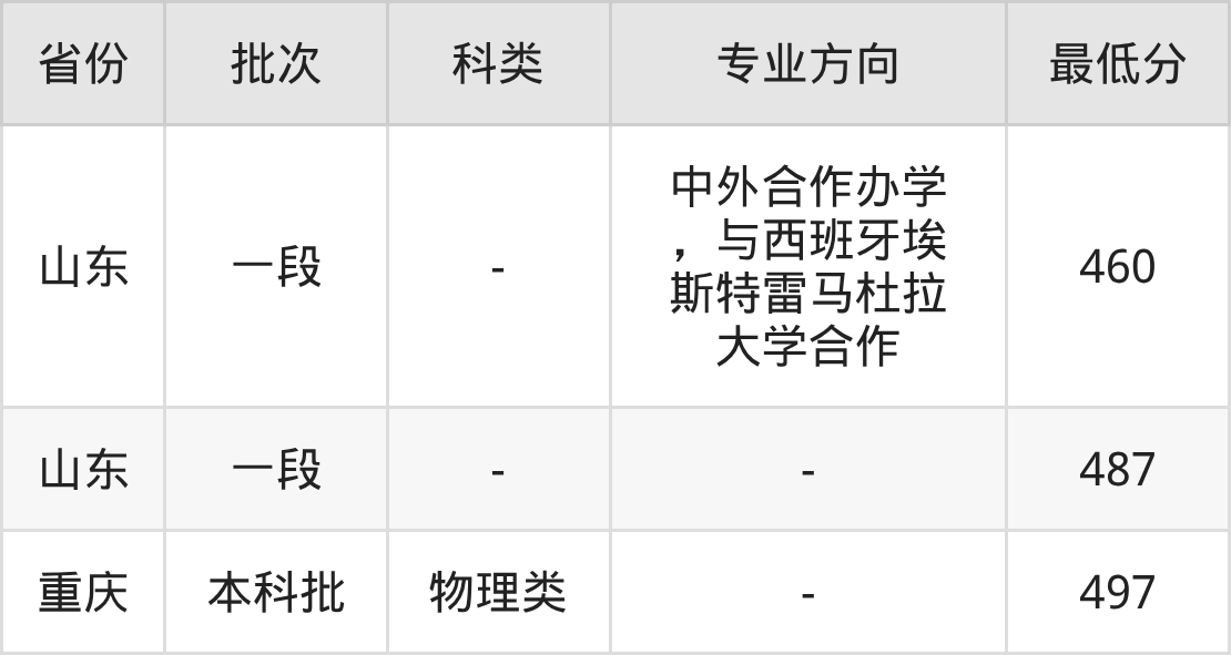 460分(中外合作辦學(xué),與西班牙埃斯特雷馬杜拉大學(xué)合作、位次285121名),487分(位次216819名)。