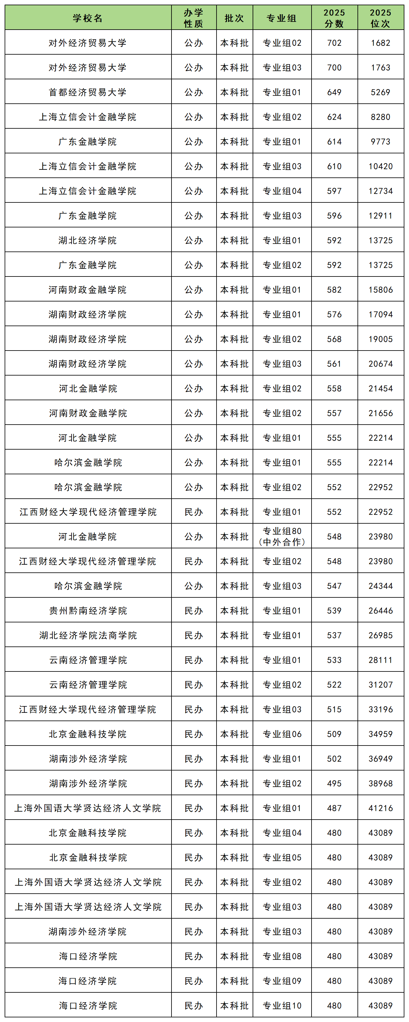 2025年金融大學(xué)最低分?jǐn)?shù)線480分,對(duì)應(yīng)收分最低的學(xué)校有??诮?jīng)濟(jì)學(xué)院、上海外國(guó)語(yǔ)大學(xué)賢達(dá)經(jīng)濟(jì)人文學(xué)院、北京金融科技學(xué)院等,想要上金融,考生省排名需達(dá)到43089名左右。