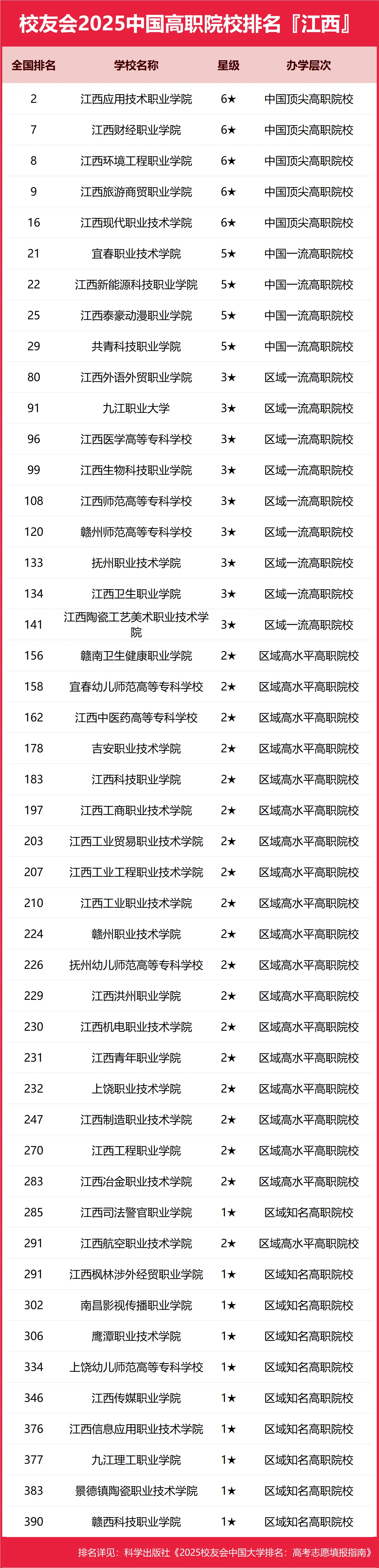 在2025校友會中國高職院校排名中,江西應(yīng)用技術(shù)職業(yè)學(xué)院全國排名第2名,也是江西省高職專業(yè)院校排名第一的??茖W(xué)校。江西財經(jīng)職業(yè)學(xué)院排名江西??圃盒5?名,江西環(huán)境工程職業(yè)學(xué)院排名江西??圃盒5?名。