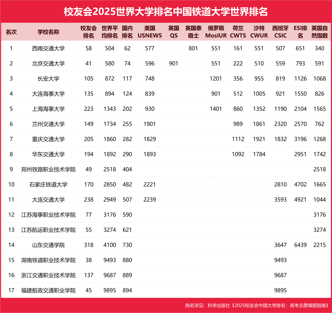 一、鐵路大學全國排名一覽表