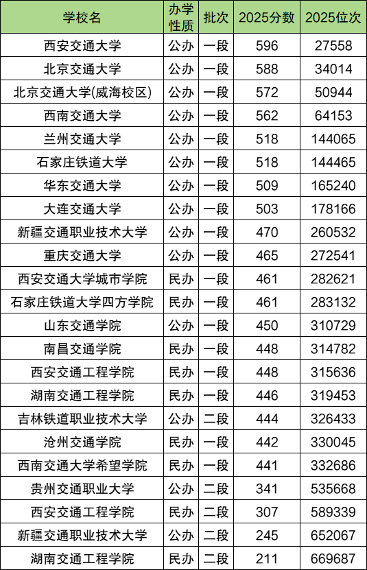 錄取分數(shù)線最高的是西安交通大學,2025年最低分596分,全省排位在27558名能上。分數(shù)線及位次斷層領(lǐng)先的還有北京交通大學(588分)、北京交通大學威海校區(qū)(572分)和西南交通大學(562分),全省排位在6.5萬名以內(nèi),其余學校排位均在14萬名以后。