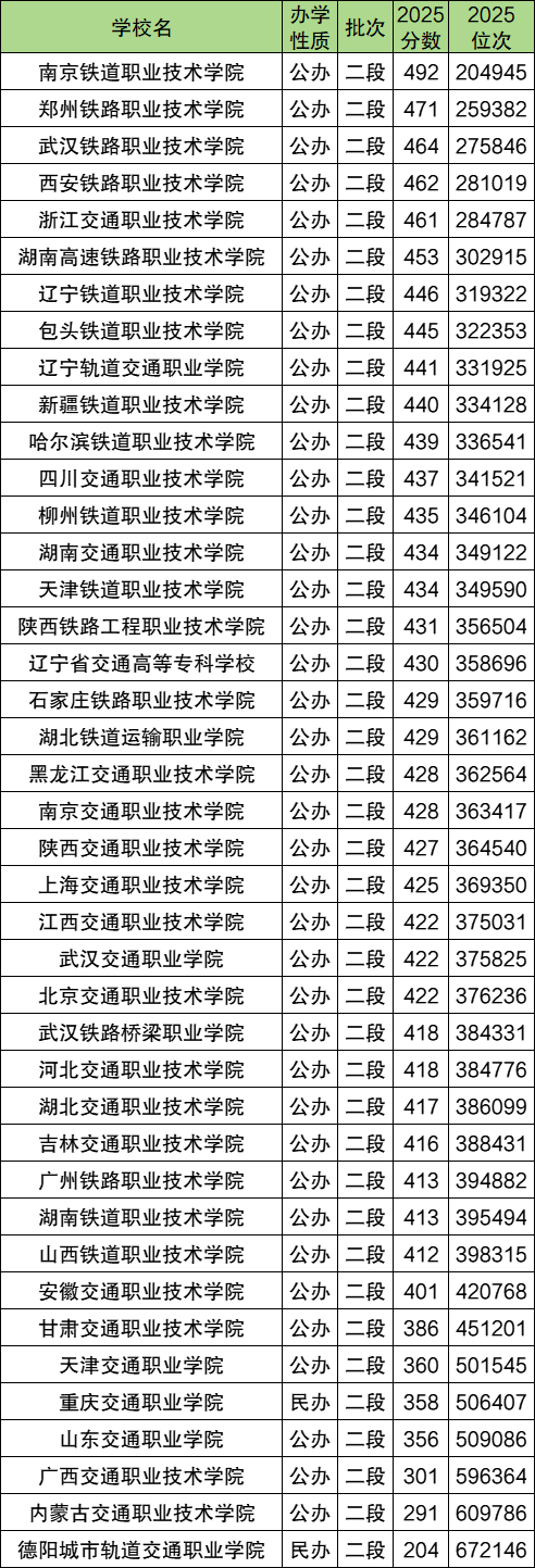 錄取分數(shù)線最高的鐵道類高職院校是:南京鐵道職業(yè)技術(shù)學院,2025年最低分492分,全省排位20萬名左右。分數(shù)線排名前五的還有471分的鄭州鐵路職業(yè)技術(shù)學院、464分的武漢鐵路職業(yè)技術(shù)學院、462分的西安鐵路職業(yè)技術(shù)學院和461分的浙江交通職業(yè)技術(shù)學院。