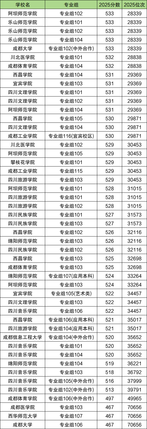 2025年四川公辦二本大學(xué)歷史組錄取分數(shù)線從467分到533分之間,對應(yīng)最低排位從70656名到28339名。