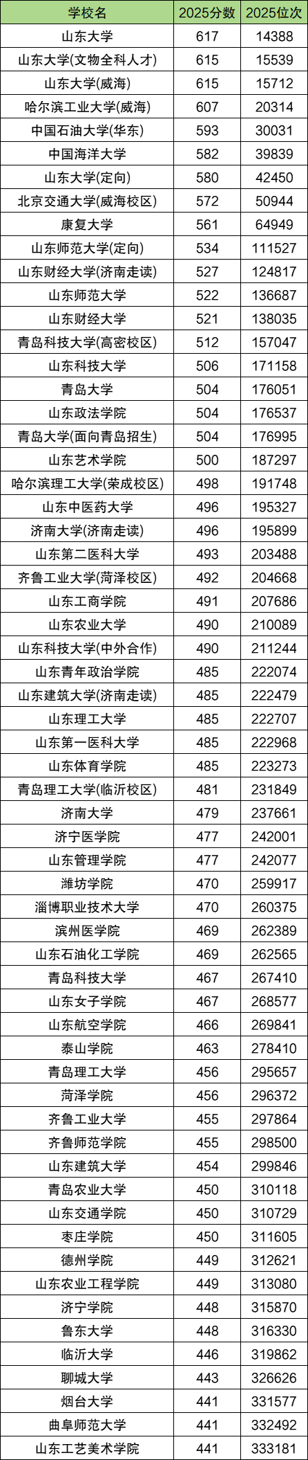 2025年山東省公辦本科大學(xué)441分到617分錄取,最難考上的是山東大學(xué),最低位次排名14388名。